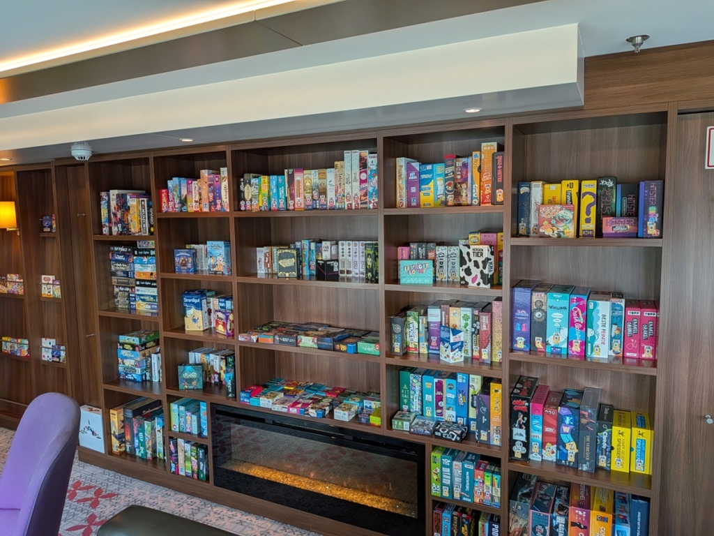 Wir brachten mehr als 650 Spiele an Deck und bereiteten diese für das Spielerlebnis der Pasagiere vor. Hier zeigte sich die unbeschreibar große Freundlichkeit der hoch internationalen Crew gegenüber uns und den Passagieren das erste Mal: Jede Person an Deck, die nichts anderes zu tun hatte, half beim Aufladen und Tische schieben. Sogar das eigentliche Bücherregal wurde leer geräumt damit wir die kleineren Spiele dort bestens übersichtlich bereitstellen konnten.