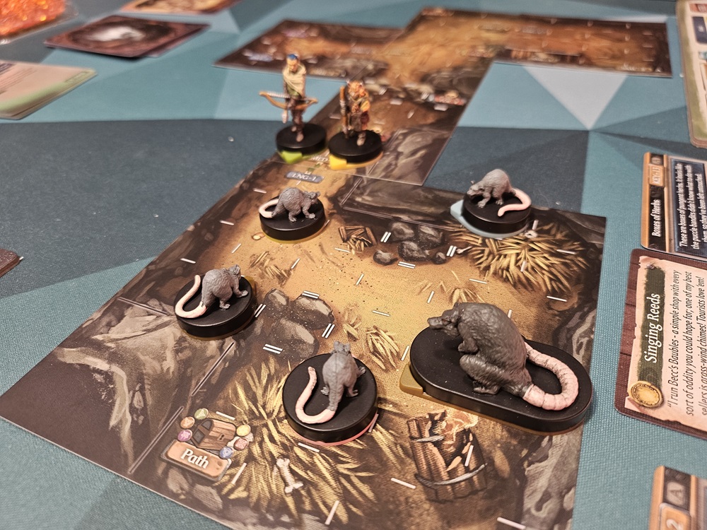 Beim zweiten Auftrag dieser Art haben wir Tomaten transportiert, hier kam als spezielle Karte auch eine übergroße Ameise vor, die noch immer scharf auf das Gemüse wie bei ihrer Herkuft war, also auch wieder eine witzige Begegnung, die tatsächlich nur mit dem Tomatentransport vorkommt. Man sollte die Karte nämlich ungesehen in den Karrenbegegnungsstapel einmischen und nach dem Auftrag aus dem Spiel entfernen. Das ist auch alles spaßig aber bringt uns auf Dauer auch nur Geld und ebenfalls nicht in der Geschichte voran.