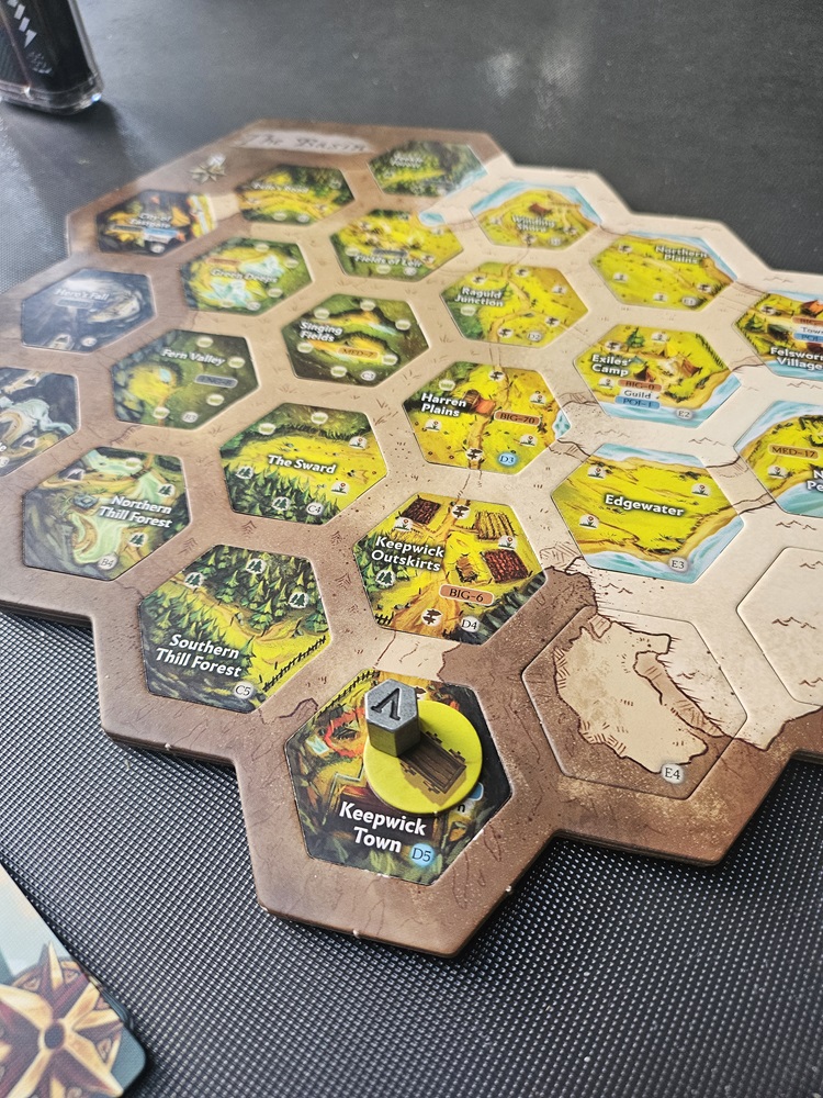 Wir benötigten den halben Spieleabend des dritten Treffens sowie ein gesamtes weiteres Treffen um unserem Fehler auf die Schliche zu kommen: Wir haben an Tag 2 aufgrund niedriger Ausdauer vermieden eine Ortskarte in einem Wald aufzudecken und zu spielen! Nun hatten wir mit den Aufgaben eine Mege Geld verdient, aber leider auch Zeit verloren, sofern es hier ein Maximum gibt. Das kann ich mir aber gut vorstellen, da die Tage gezählt werden und nach und nach immer neue Karten zu dem Zeitstapel hinzugefügt werden. Es fühlt sich aber an, als hätten wir noch eine Menge Zeit übrig. Diesen vermeidbaren Fehler nun gefühlt endlich gefunden zu haben steigerte unsere Motivation sehr. Allerdings verschoben wir die Fortsetzung dieser Geschichte auf den nächsten Spieltag.