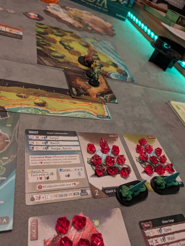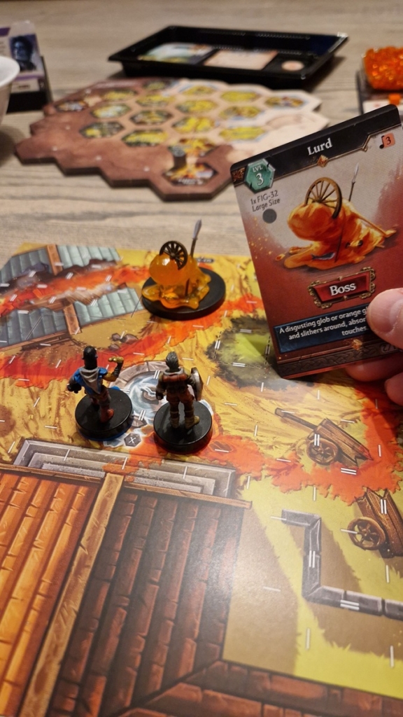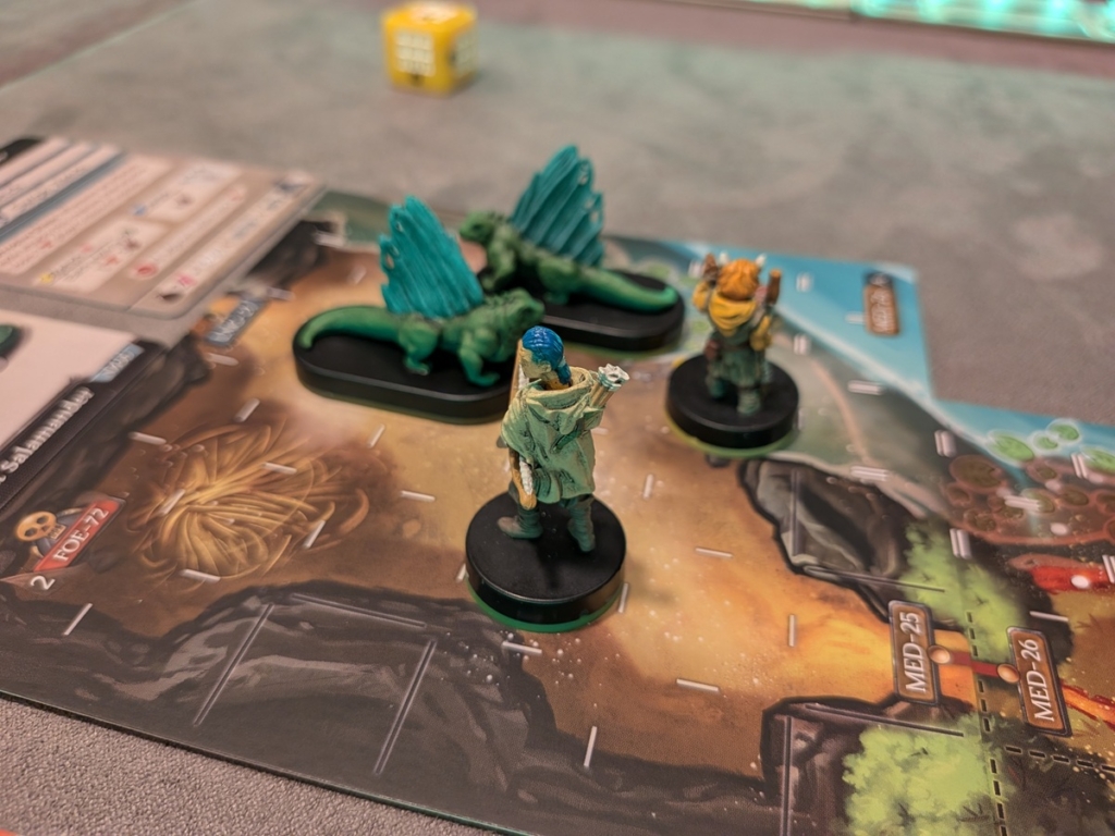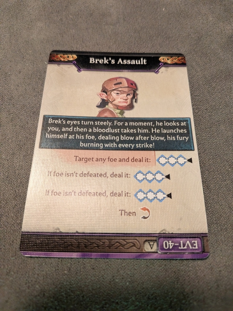 Sein Angriff besiegte zwar instant die eine Echse, leider musste die oben stehende Karte gedreht werden und so wurde Brek durch das sterbende Monster in einen heroischen Tot gebissen und musste den Kampfkartenstapel so unrühmlich verlassen.