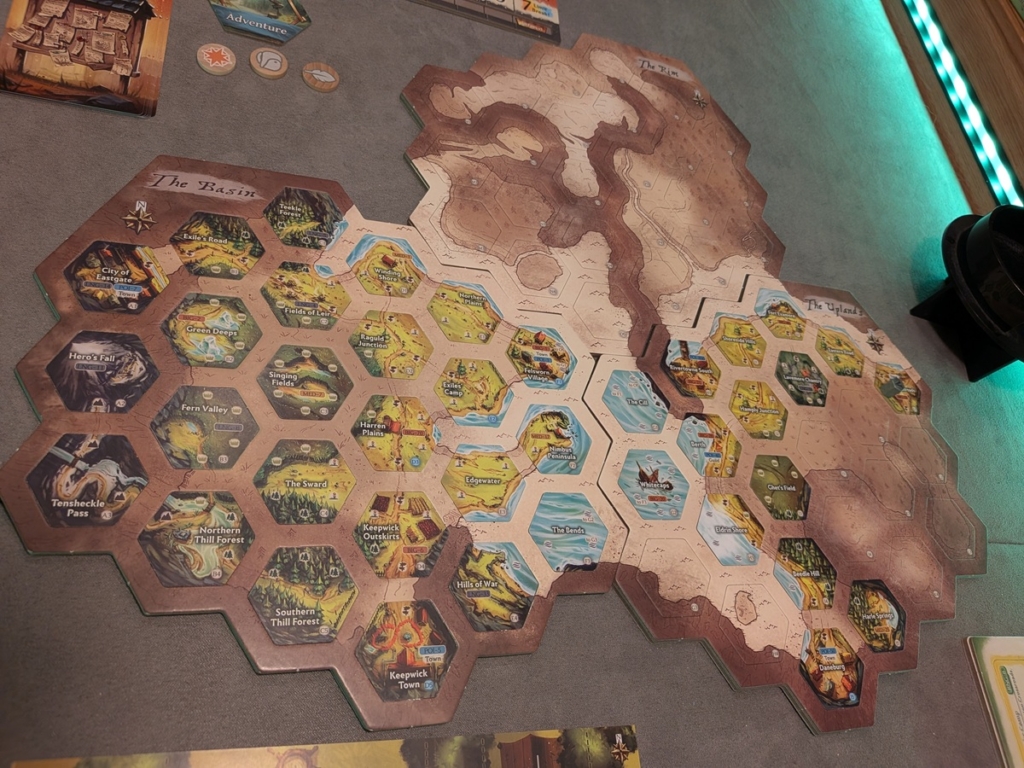 Ich habe mal alle drei Inselkarten nebeneinander ausgelegt. Das werde ich zukünftig auch immer für Sascha und mich am Spieltisch so machen, da es eine gute Gesamtansicht bietet. Klar verstehe ich, dass es am Anfang nicht mehr als sie eine der drei Karten gibt, um den Überraschungsmoment zu generieren, wenn die Spielenden bemerken, dass das Spiel viel größer ist, als gedacht. Aber nun, da wir es wissen, sollte man die Karte besser stets als eine sehen.