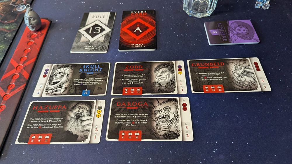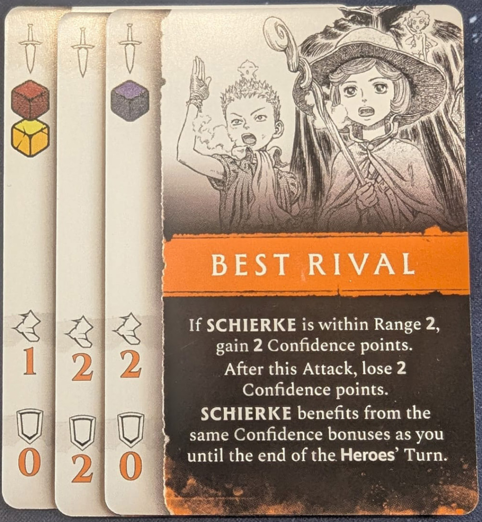 Oh Boy, ist das platt. Die Gegner laufen simpel auf den nächsten Helden zu und würfeln stumpf ihren Angriff. Ereignisse können für eine Aktivierung eine andere Zielpriorität setzen („Greife den Helden mit den wenigsten Schilden an“), danach schaltet der Boss wieder in Kartoffelbetrieb. Ergebnis: Er wankt einmal zu Schierke, dreht dann doch auf halbem Weg ab, weil Guts näher steht. Das wirkt… sagen wir mal nicht nach „Griffith-4D-Schach“, sondern mehr nach „Oger sucht Schlafplatz“.