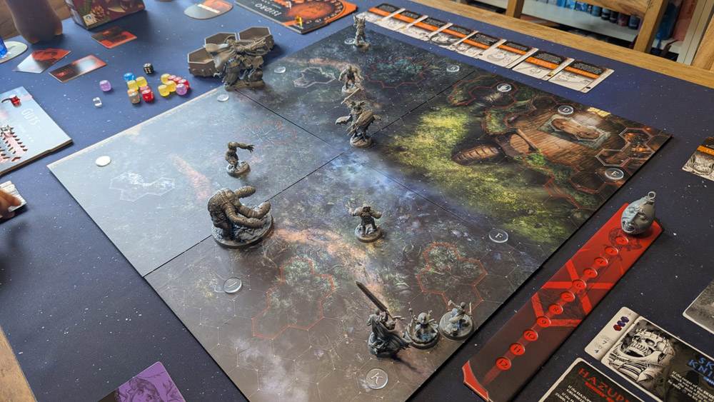 Positiv find ich das die Gegner keine reinen HP-Schwämme sind. One-Hit-Kills bei Normalos sind drin, Bosse halten mehr aus, kippen aber mit etwas Glück nach ein paar satten Treffern. In unserem Szenario haben sich besiegte Bosse zu einer größeren Form gemausert (plötzlich 70 HP). Ich dachte schon: „Na toll, doch Schwamm.“ Aber das Szenarioziel verlangte nur, beide auf 50 Wunden runterzuprügeln – völlig okay, dadurch spielte es sich angenehm schnell. Wir haben ca. 90 Minuten gebraucht. Später in der Kampagne musst du sie vermutlich auch mal komplett runterhauen – hoffentlich mit passenden Rahmenbedingungen.