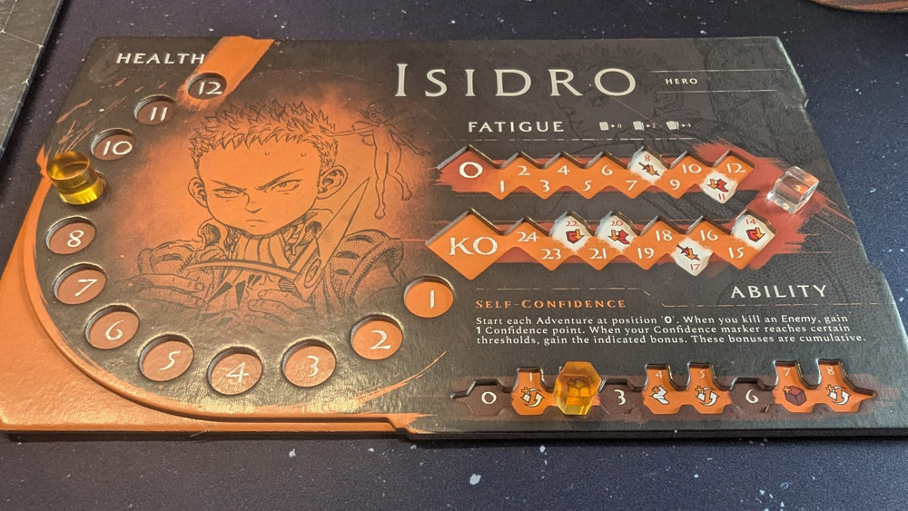 Doch Björn, warum sollte ich denn dann nicht immer drei Karten spielen? Ja hier kommt das Ermüdungs/Fatigue-System ins Spiel. Überschreitest du deinen Ermüdungswert, kippst du erschöpft zusammen und bist raus. Eine Karte = 0 Müdigkeit, zwei Karten = 2, drei Karten = 4. Du siehst also bei drei Karten steigt die Ermüdung schon enorm und würdest du immer drei Karten spielen, hältst du nur 6 Runden durch. Ab bestimmten Schwellen hagelt’s Mali, die je nach Charakter an unterschiedlichen Zeitpunkten auf der Leiste auftreten. Isidro, der Frischling, ächzt schneller als die anderen – sehr thematisch, aber auch sehr bremsig.