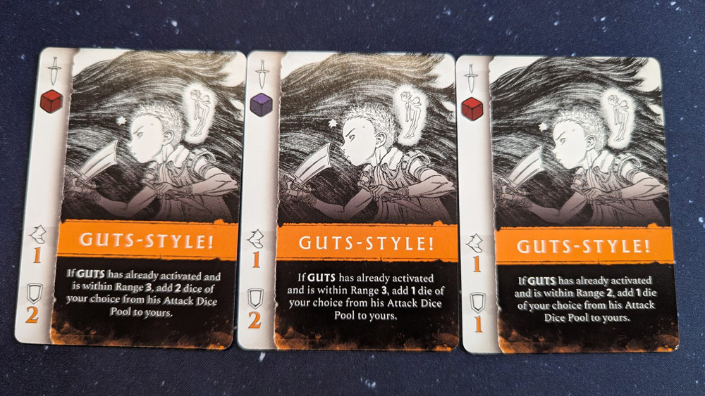 Am Anfang fühlt sich das Puzzle nett an, danach werden die Rundenabläufe jedoch flott repetitiv. Die harte Bestrafung fürs „groß aufdrehen“ lädt nicht gerade zum Anime-Feuerwerk ein. Jeder Held hat zwar eine eigene Mechanik – Isidro sammelt durch das Töten von Monstern z. B. Selbstvertrauen für permanente Boni, kann’s per Karte kurzfristig boosten und sogar teilen – doch am Tisch herrscht trotzdem die bekannte Monolith-Formel: Hauptprotagonist ballert, Sidekicks fegen nochmal durch. Das passt zur Vorlage, fühlt sich aber spielerisch mau an: Guts haut 22 Schaden in einem Schlag raus, Isidro kratzt mit Ach und Krach an 9, wovon 7 am Schild des Bosses einfach verpuffen. Also Kleinvieh wegräumen und Nebenjobs erledigen? Blöd nur, dass du dadurch oft zu weit weg von den anderen stehst und viele Karten-Synergien verpuffen.