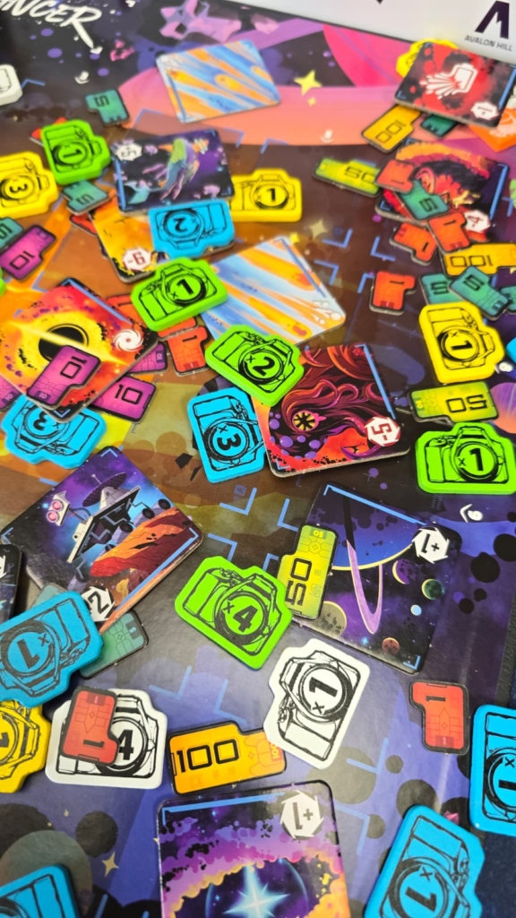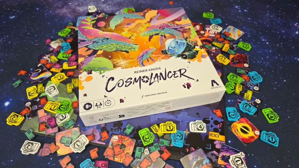 In Cosmo Lancer sind wir Weltraumfotografen und versuchen in drei Runden so viele Punkte wie möglich zu erlangen. Dabei ziehen wir jede Runde ein Bildplättchen vom Stapel, nehmen das eine, welches uns für die Runde zufällig zur Verfügung stand oder nutzen eine Kamera mit einem Multiplikator von ein bis vier. Die drei genannten Optionen geben uns damit ein Spielelement, welches wir in einem 6×6-Raster frei auslegen. Die Bildplättchen vergeben Punkte von -6 bis +6 oder stellen Ereignisse dar, die z.B. eine Reihe unterbrechen können. Die Kameras multiplizieren die erhaltenen Punkte. Am Rundenende werden die Punkte Reihe für Reihe sowie Spalte für Spalte vergeben und der Plan abgeräumt. Kameras erhalte ich nur mit dem Faktor 1 zurück. Am Ende der dritten Runde gewinnt die Person, die am Meisten Punkte sammeln konnte.