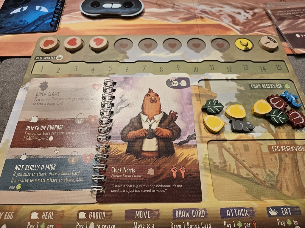 Und somit verwunderte es auch nicht, dass er es letzte Woche zu einem gemeinsamen Abend Dead Reckoning als Absacker mitbrachte. Den Rang als Absacker trifft es nicht ganz, da es mit Erklärung schon eine gute Stunde Spielzeit verlangte. Aber es spielt sich fluffig als kleiner Boss Battler mit einer Priese Humor. Wann sonst kann ich „Cluck Norris“ und „J.R.R. Yolkien“ spielen?