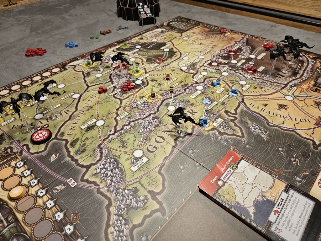 Anstatt vier Gegenmittel zu finden, müssen wir hier vier Ziele erfüllen, wovon eines immer die Vernichtung des einen Ringes ist. Die anderen drei Ziele werden aus einem Vorrat von über zwanzig Karten zufällig gezogen. Jede Person verwaltet gleichzeitig drei Spielfiguren, welche neben den sechs Standardaktionen mit ihren eigenen, gut zu der Figur passenden Fähigkeiten daher kommen. Anstelle von Stadtkarten gibt es Gefährtenkarten, mit denen wir immer wieder gleiche Symbole sammeln. Zudem sind anstelle der Krankheitswürfel nun Schattenarmeen auf der Landkarte, die sich auch noch bewegen können um die Zufluchten der alliierten Völker einzunehmen. Nazgul fliegen bedrohlich über die Lande und verfolgen Saurons Blick der versucht Frodo und den einen Ring im Auge zu behalten aber oft von den Schlachten auf Mittelerde abgelenkt wird.
