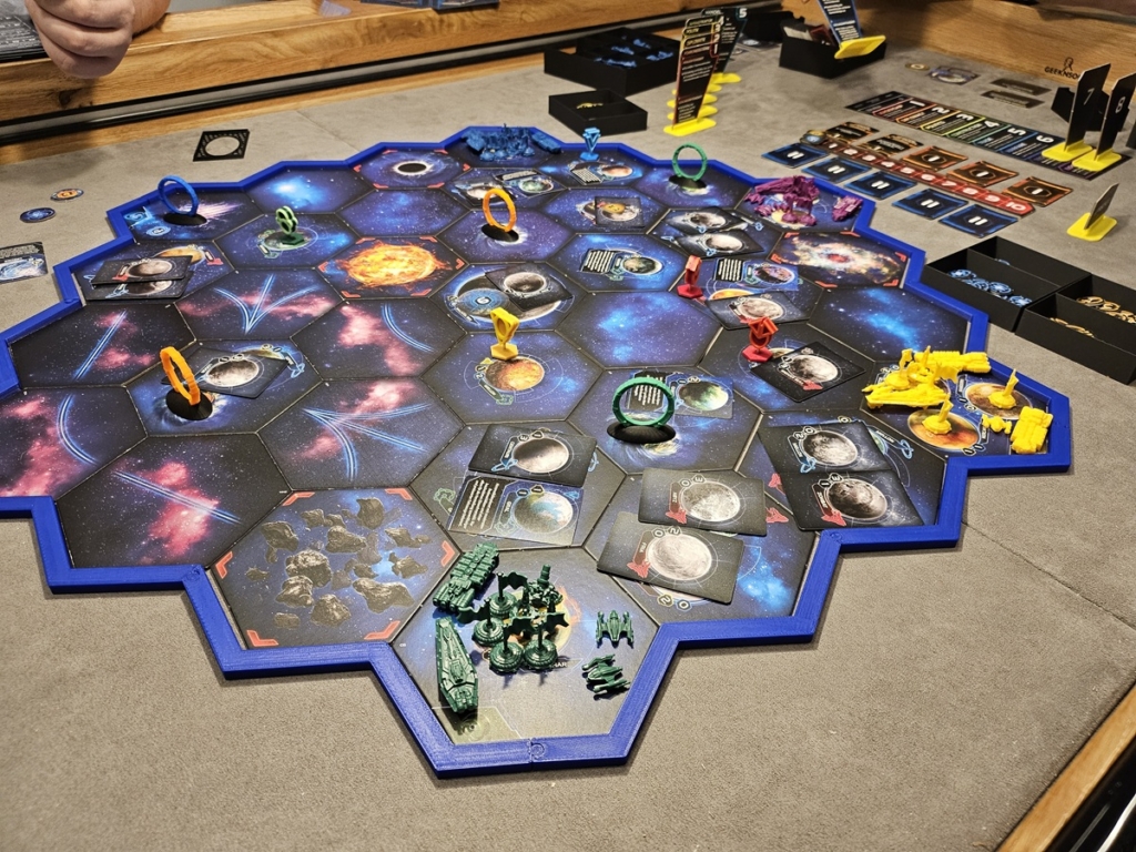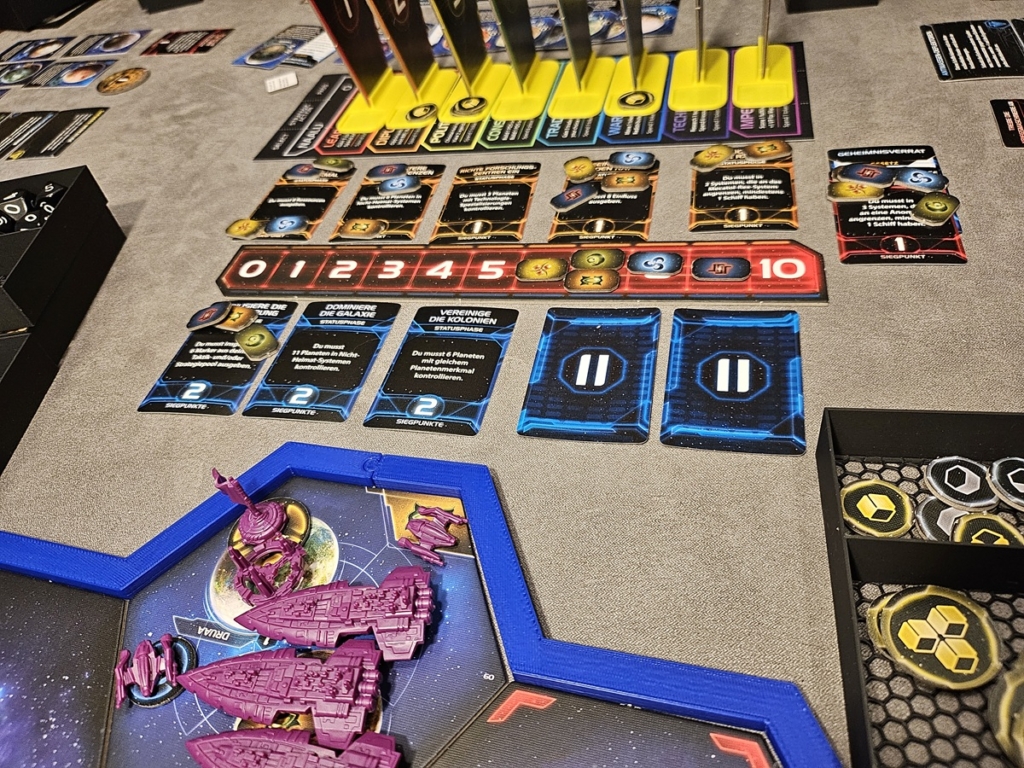 Das Spiel strotzt nur so vor Flavor-Texten und schönen Zeichnungen. Alleine die Hintergrundgeschichten der verschiedenen Völker ergeben wahrscheinlich inhaltlich ein kleines Buch. Die Spielrunde startet mit der Vergabe der unterschiedlichen Rollen in Spielerreihenfolge, zehn davon an der Zahl, welche die Initiative und damit die eigentliche Spielerreihenfolge für die Spielrunde festlegen. Wenn man dran ist führt man seine Aktion durch und die anderen dürfen diese Aktion ebenfalls, aber abgeschwächt ausführen – ähnlich wie man es aus Erde kennt. Hier baut man Werften und planetare Schutzkanonen, darf handeln oder Technologien verbessern. Mit Strategiepunkten erhalte ich zusätzliche allgemeine Aktionen und mit Taktikkarten kann man ebenfalls in das Spielgeschehen eingreifen. Auch Weltraumschlachten sind mechanisch einfach und schnell abgehandelt. Es kommt kaum Langeweile auf, da man immer etwas zu tun hat. Es ist dann aber insgesamt so viel, was jeder einzelne stets auslösen kann, dass die Spielzeit nun mal zusammenkommt. Auch wenn wenn es sich bei Weitem nicht so lange anfühlt.