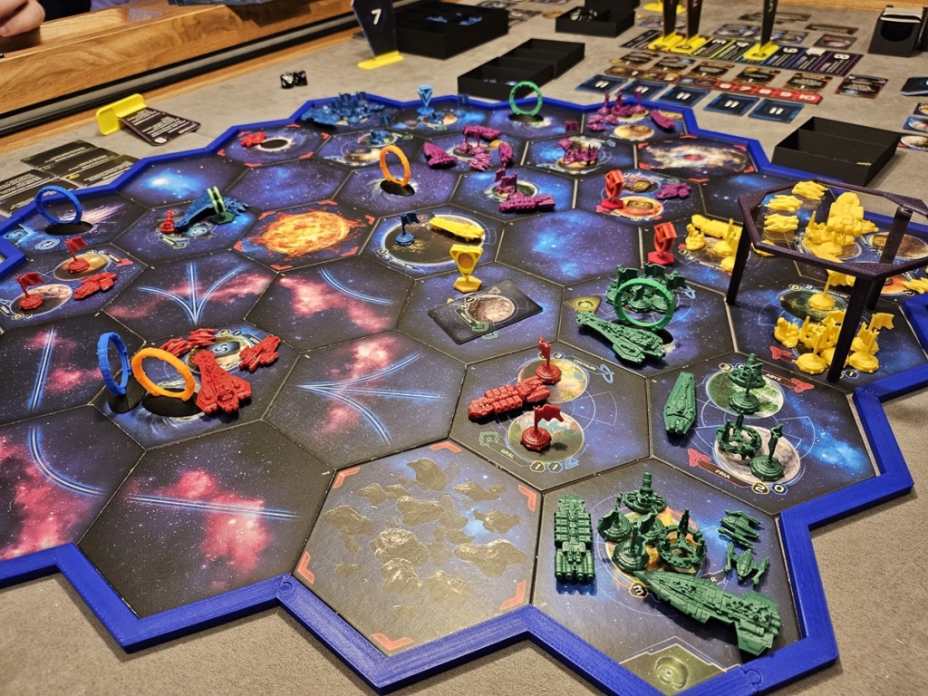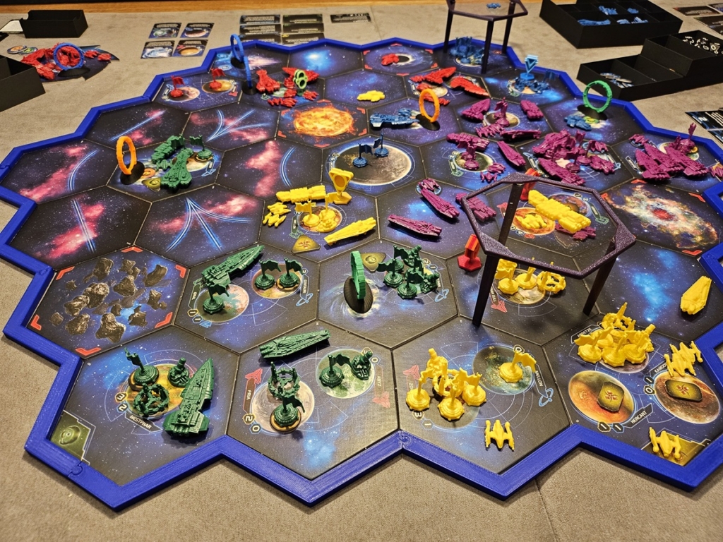 Vor zwei Wochen war es nun wirklich so weit. Nach einer Anfrage im Chat des örtlichen Brettspielvereins kam es zu einer Verabredung bei mir zuhause im Spielkeller. Wir waren fünf Herren und trafen uns bereits um 10:00 Uhr für den Aufbau, damit wir möglichst um 11:00 Uhr mit der Erklärung für die beiden Newbies beginnen konnten. Das eigentlich Spiel lief von 12:00 – 20:45 Uhr (inkl. 45 Minuten Kaffee und Kuchen-Pause). Also 8h Spielzeit ist nun das, was man vom Hörensagen auch erwartet und ich war froh, dass diese Zeitvorgabe irgendwie eingehalten wurde,