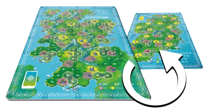 Das Spielbrett hat zwei unterschiedliche Seiten: Schottland und Irland. Ersteres ist eher die familietaugliche Einstiegsvariante. Die Zielkarten erhält man zufällig von einem verdeckten Stapel. Von daher ist es nicht von Anfang an planbar in welche Richtung man spielen sollte. Man legt von Runde zu Runde vor sich verdeckt liegende Plättchen in Spielerfarben. Wenn man eins auf das Spielfeld gelegt und Punkte erhalten hat, ist der nächste Spielende an der Reihe. Bis man wieder dran ist zieht man wieder eines der eigenen Plättchen und kann bereits zu den Gegnerzügen überlegen, wo man es als nächstes platziert. So einfach ist es eigentlich.