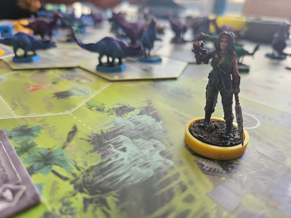 Episode 2 spielt nun einige Jahre später, was das Spiel auch mit einem neuen Spielbrett und neuen Miniaturen darstellt. Das Spielbrett zeigt uns hier nicht mehr nur den Strand und die nähere Umgebung, wo wir mittlerweile intakte Verteidigungswälle vorfinden und die Siedlung damit als sicher gilt, sondern auch die Wälder tiefer im Inneren der Insel. Diese wollen wir in der neuen Episode erforschen und unsere Außenposten dort draußen sicher vor den Dinos bauen um an wichtige Ressourcen zu kommen. Und zudem können wir eine antik wirkende Pyramide am Firmament erkennen…