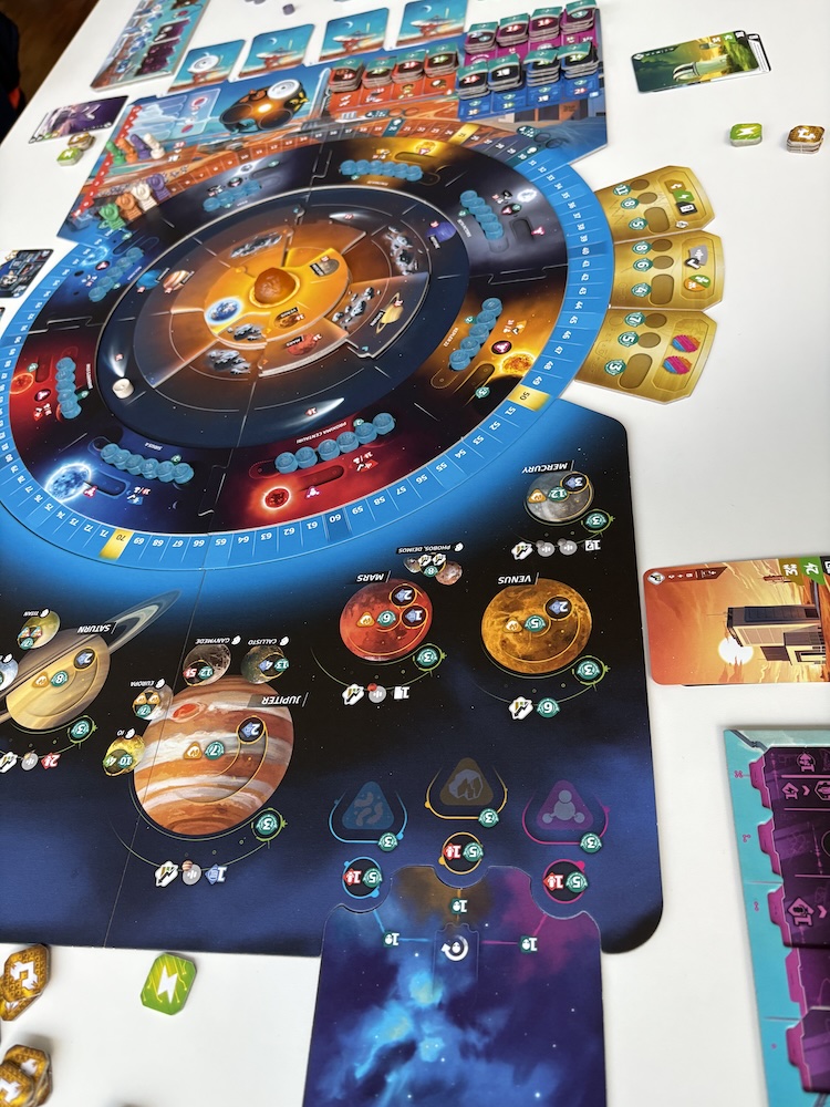 Als Jugendlicher und Student habe ich stundenlang Zeit gehabt, um mir die Fortschritte meines eigenen SETI-Bots auf dem heimischen Rechner zu zusehen. Nun konnte ich endlich selbst – zumindest auf dem Spielbrett – nach Leben forschen. Ich fand es erstaunlich zugänglich und leicht herunterzuspielen. Wir haben direkt eine Partie zu viert gespielt (mit drei SETI-Neulingen) und das kostet ganz schön Lebenszeit. Knapp vier Stunden waren wir in unserem Sonnensystem unterwegs. Aber es war spannend bis zum Schluß. Für mich kamen etwas Terraforming Mars Vibes auf. Nicht wegen dem Weltraum-Thema oder so. Einfach, weil es schnell erklärt war und man es schnell spielen konnte. Klar gibt es eine Lernkurve für das nächste Mal. Ich kann verstehen, warum es gerade so viel gepushed wird (und sogar auf Platz 3 des Deutschen Spielpreis gelandet ist). Als ich mit Björn darüber gechattet habe, war ich verwundert, dass es bei ihm gar nicht gezündet hat. Heißt also, dass es noch weitere Partien benötigt. Aktuell