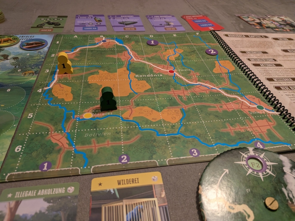 Mit den Handkarten kann ich Bewegungen auf den Straßen oder auf Flüssen ausführen. Wenn ich einen Missionsort erreiche, zum Beispiel eine illegale Abholzung, und die Voraussetzungen erfülle, kann ich die Mission für die Gruppe abschließen und erhalte einen Erfolgsmarker sowie etwas Geld, welches ich thematisch beschrieben z.B. durch den Verkauf illegaler Werkzeuge, Fahrzeuge, etc. verdiene. Eine Mission kann auch Gefahren beinhalten und damit meiner Spielfigur Schaden zufügen. Zusätzlich gefährlich wird es, wenn ich mich in einen indigenen Bezirk wagen muss und mein Charakter nicht die Fähigkeit besitzt, mit diesen zu verhandeln. Wenn eine Figur Zuviel Schaden sammelt, muss diese in den ungewollten Ruhestand. Andererseits kann ich die Handkarten auch in der Runde vermieten und erhalte temporär das unten angezeigte Geld.