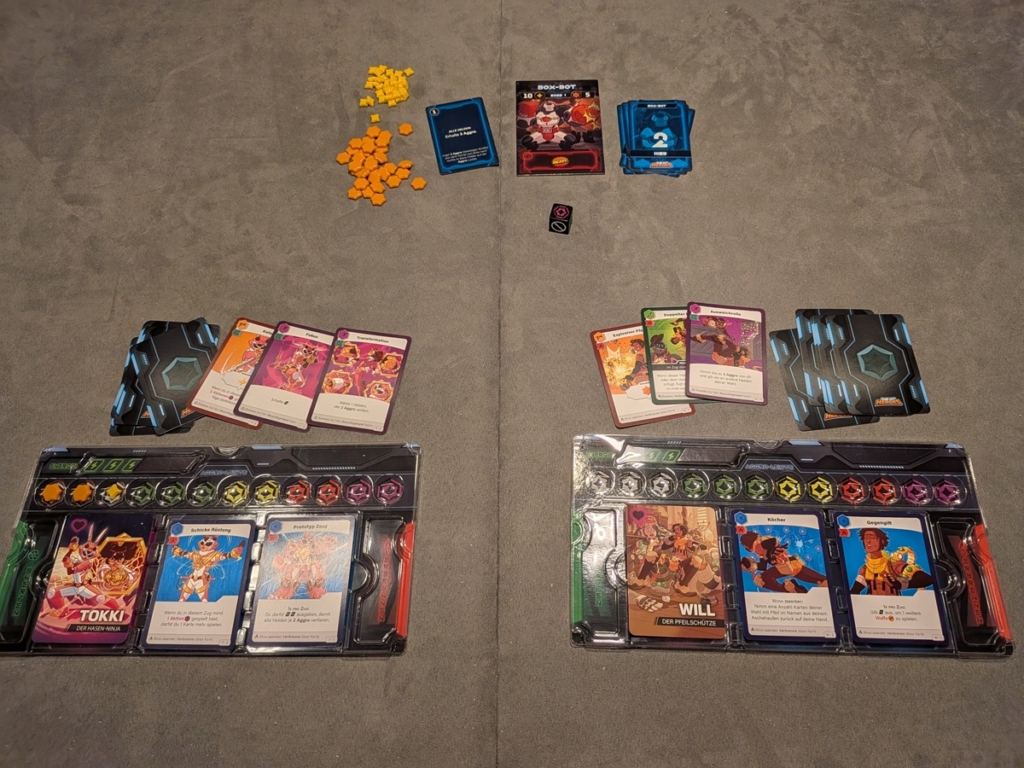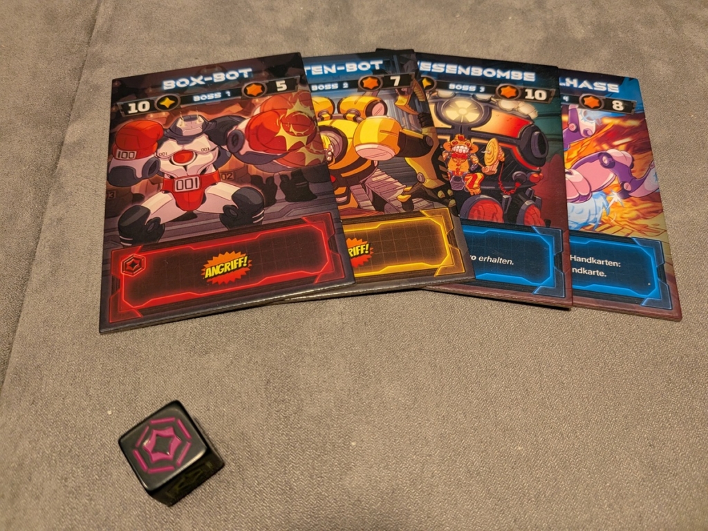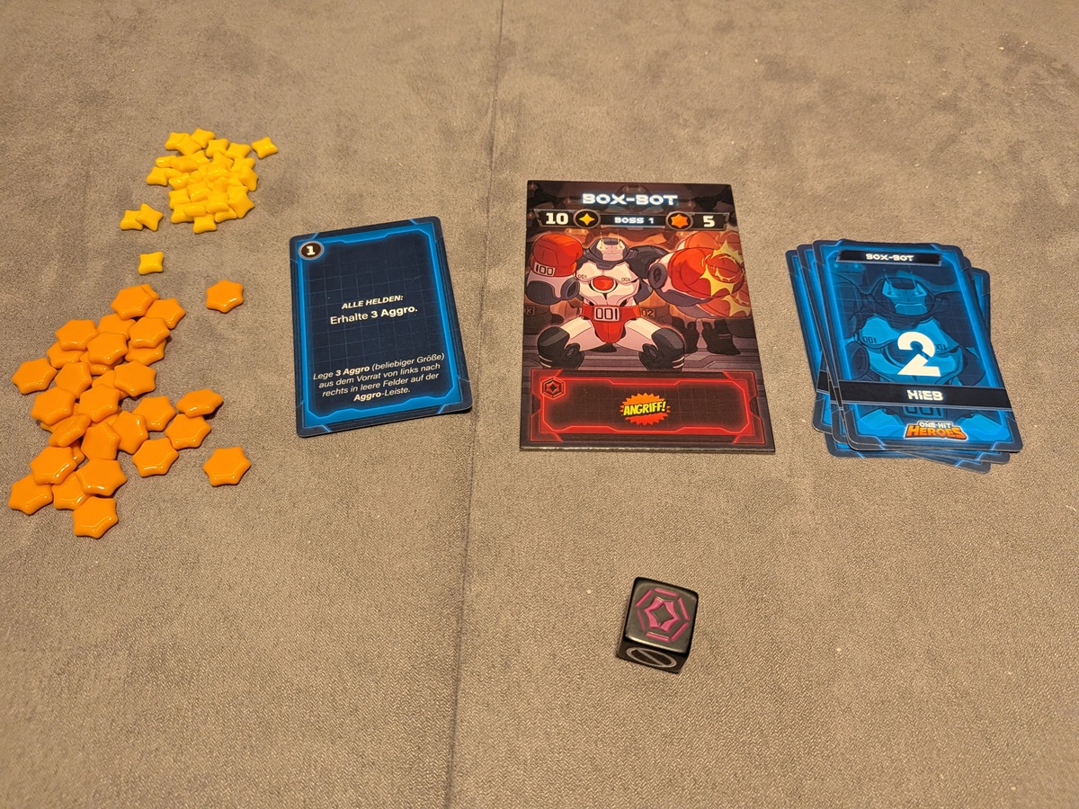 Der gegnerische Boss zeigt auf der Rückseite der Bot-Tafel noch ggf. Sonderregeln die zu beachten sind. Ansonsten wird die Tafel ausgelegt und das Boss-Deck ungemischt in vorgegebener Reihenfolge bereit gelegt. Der Kampfwürfel und die Agro-Marker werden bereit gelegt.