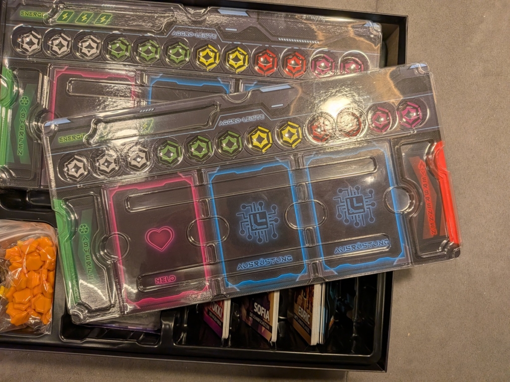 Ebenfalls angenehm sind die Spielerboards. Sie sind zwar nicht besonders hübsch gestaltet und sehen ein wenig billig zusammengebaut aus, aber sie sind sehr sinnvoll für das Spiel. Ich denke ein einfaches Double-Layer-Board wie man es heutzutage kennt, hätte den selben Zweck genauso gut erfüllen können und wäre vielleicht hübscher ausgefallen, aber das ist eigentlich keine Kritik wert.