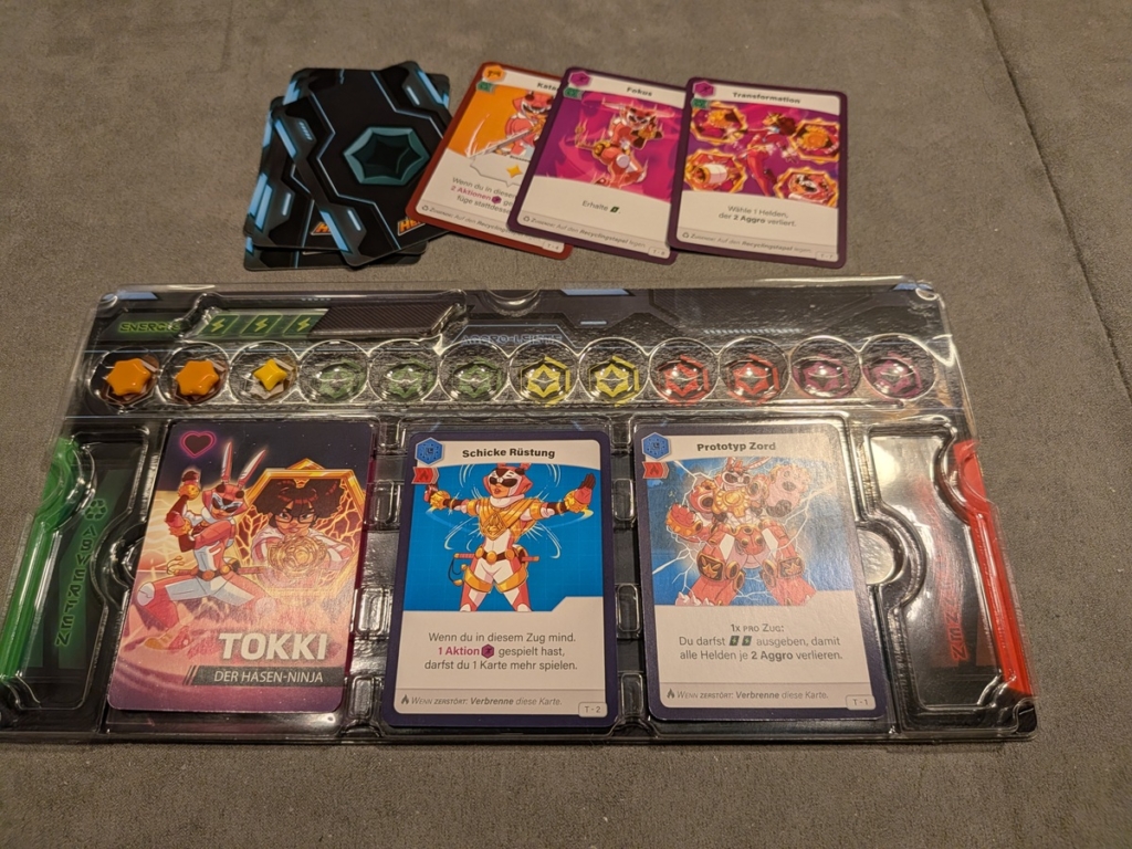 Die Spielkarten sind in Standardqualität aber schön kräftig bunt dargestellt. Die Schadens- bzw. Agro-Marker sehen gut aus und sind so geliefert unkaputtbar. Hervorzuheben sind in meinen Augen die eingetüteten Belohnungskarten für das besiegen der Gegner, so gibt es im ersten Spiel auf angenehme Weise einen Überraschungseffekt. Passt nur beim Aufreißen der Tüten auf, die sehen sonst schnell sehr unschön aus. Ich schneide die Tüten auf. So kann man die Karten nach dem Spiel wieder optisch hübsch zurücksetzen.