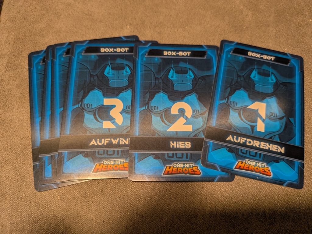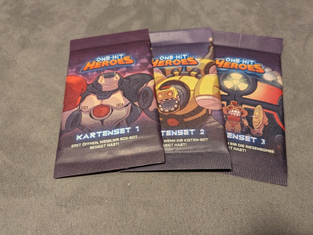 Die Angriffe der Gegner sind stets sehr gefährlich und darum muss unbedingt auf die Reihenfolge der Bot-Aktionen geachtet werden. Wenn man ausversehen weitere Agro-Punkte durch die Bot-Karte zuerst verteilt und dann den Angriff der auf der Bot-Tafel aber vorher dran gewesen wäre, kann das Spiel schneller vorbei sein, als man denkt. Denn die Agro-Punkte stehen gleichzeitig für die Verletzlichkeit des Charakters in dem Moment: Je mahr Agro, desto leichter bin ich zu treffen. Und hier kommt die Crux: Wie der Name des Spiels sagt, sind unsere Helden mit nur einem Treffer besiegt. Wenn nur ein Charakter schaden erleidet, ist er damit überwältig und das Spiel für alle verloren. Immerhin kann man bei einem Treffer eine blaue Ausrüstung abwerfen um den Schaden zu vermeiden, aber davon habe ich auch nicht unendlich.