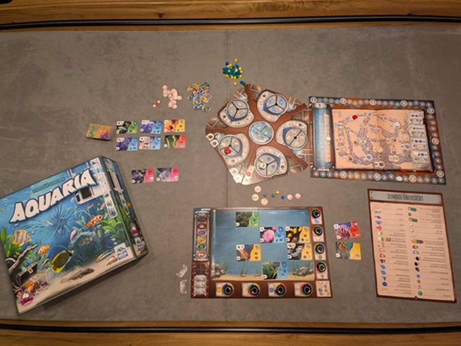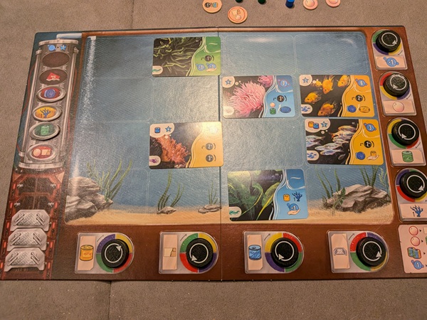 In diesem gehobenen Kennerspiel hat jede teilnehmende Person, maximal 4 an der Zahl, ein Spielertableau ausliegen. Dieses stellt das Aquarium dar, in welchem wir unsere Karten als Fische, Anemonen oder Pflanzen auslegen. Zudem befinden sich hier 8 Stellrädchen für unsere sogenannte Mikroflora. Wenn diese zum Rundenende richtig eingestellt sind, erhalten wir zusätzliches Einkommen. Auch auf dem Tableau zu finden, ist unser Filter. Diesen können wir im Laufe des Spiels verbessern und sobald alle fünf Filterelemente ausliegen, wird die Engine darüber ausgelöst. Neben den Belohnungen unserer bis dahin erhaltenen Filteraufwertungen ist unser derzeitiger Sauerstoffgehalt sehr wichtig, der uns im Normalfall Siegpunkte beschert, ggf. aber auch welche abziehen kann. Der Filter wird in einem Spiel normalerweise mehrfach ausgelöst.