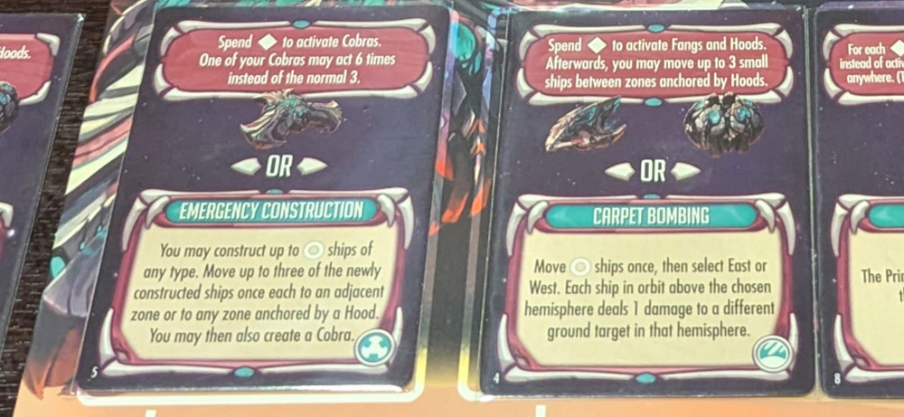 Die oberen Karteneffekte aktivieren bestimmte Raumschiffe – von denen ich gleich vier Typen habe – und der untere Effekt sorgt meist für Bombardierungen, Neubauten von Schiffen, Hilfe für meinen Spielpartner oder andere charmante Alienbeschäftigungen.