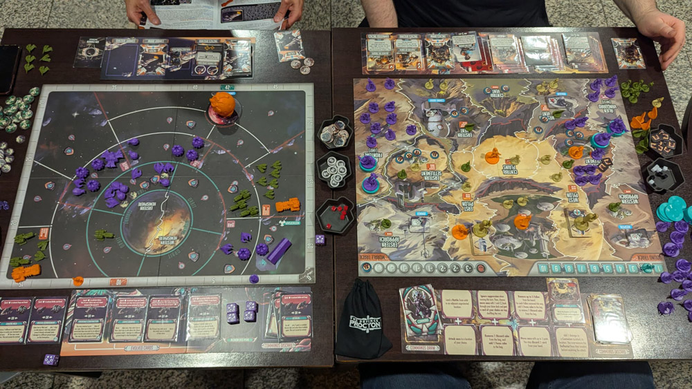 Nach zwei Runden hatte ich den Dreh raus und begann, mit meinem Alienfreund Synergien aufzubauen. Er spielt ganz anders: Seine Karten legen fest, wo auf der Planetenoberfläche Aktionen stattfinden. Bei Angriffen zieht er Würfel aus einem Beutel – schwarze verursachen Schaden, weiße bedeuten: „Die Menschen haben Glück gehabt.“ Mit bestimmten Effekten kann er den Beutel manipulieren, während ich ihm helfen kann, überflüssiges „Menschenglück“ zu entfernen.