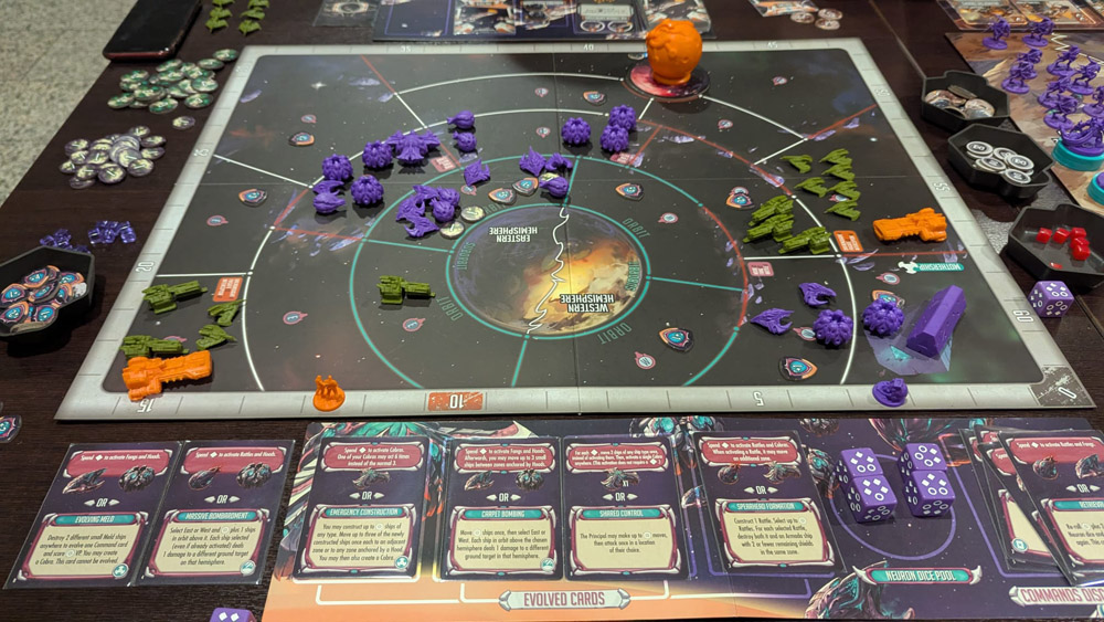Ich kämpfte im All gegen die Armada der Menschen, die von der Erde Verstärkung geschickt bekommen hatten. Während die Former über Dice Pools und Handkarten gesteuert werden (also planbar und angenehm unglücklichkeitsfrei), arbeitet die menschliche Armada mit Zugprogrammierung und Ressourcenmanagement – was deutlich mehr Chaosfaktor mit sich bringt. Oder wie wir Alien sagen: Menschliches Versagen.