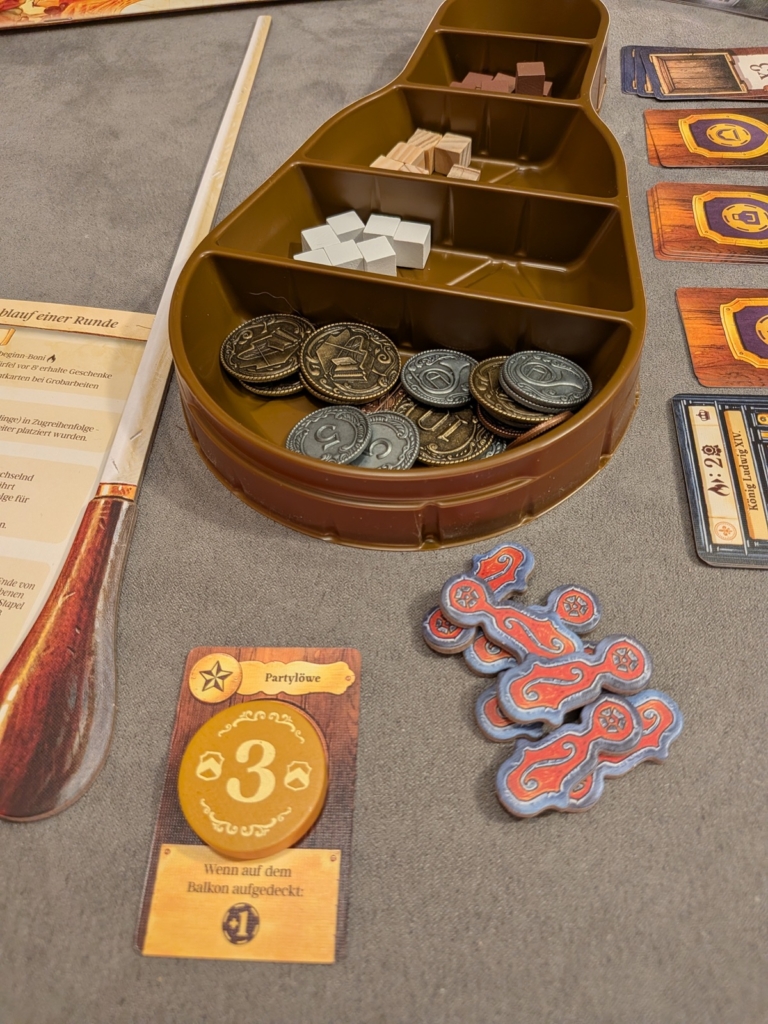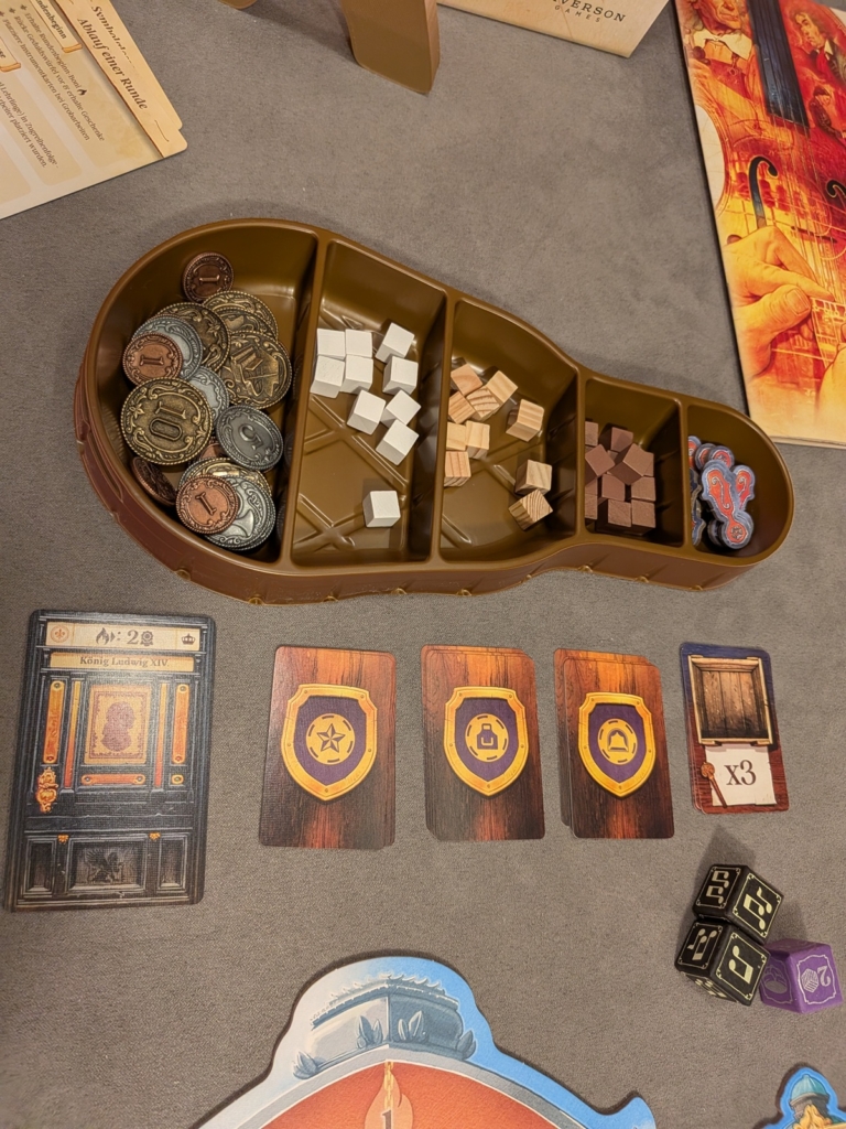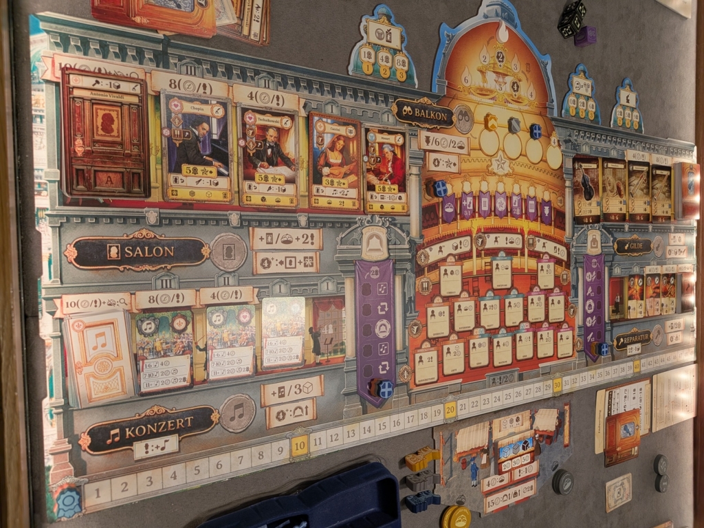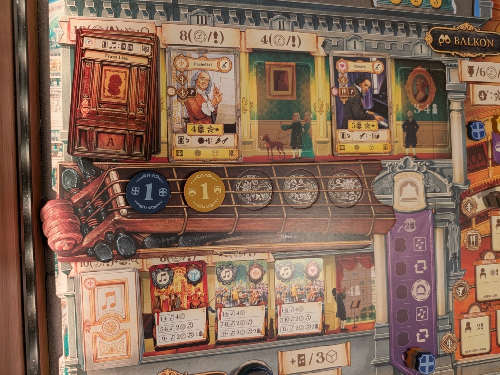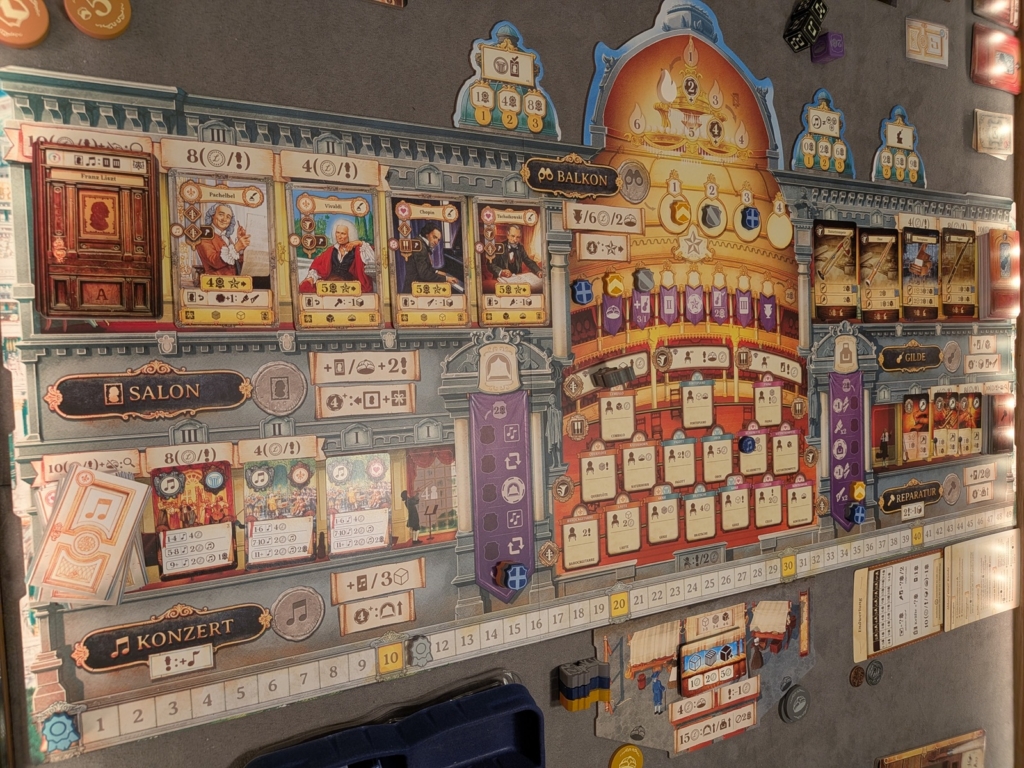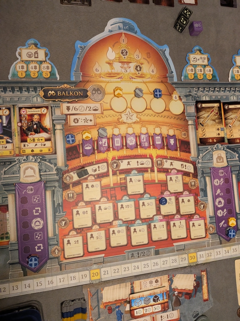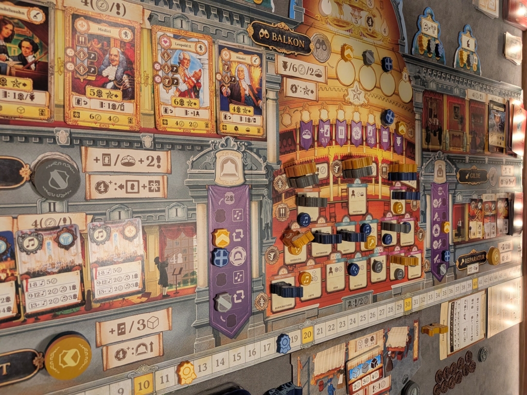 Im Balkon über dem Saal können wir die Spielerreihenfolge bestimmen und ggf. eines der variablen Spielziele (die kleineren Kuppeln darüber) erfüllen und uns so weitere für das Spiel wichtige Boni freischalten. Die drei lilafarbenen Banner um den Saal herum zeigen unsere Fähigkeiten in der Werkstatt (rechts), auf der Bühne (links) oder den Fortschritt beim Erfüllen der Wünsche unserer Mäzen (oben). Unten sieht man den Markt, die Preise ändern sich zufällig von Runde zu Runde. Über den Marktkarten erkennt man die Preisfenster. Somit kosten Tierprodukte immer zwischen 1-3, Holz 2-4 und Metalle 4-6 Münzen. Auf der großen Kuppel oben befindet sich die Rundenanzeige. Zwischen den Runden 2-3 und 4-5 erhalten wir Zuwachs unserer Arbeiter. Zwischen den Runden 3-4 werden die Mäzen „A“ gegen „B“ getauscht. Letztere bieten uns Siegpunktbewertungen am Spielende.