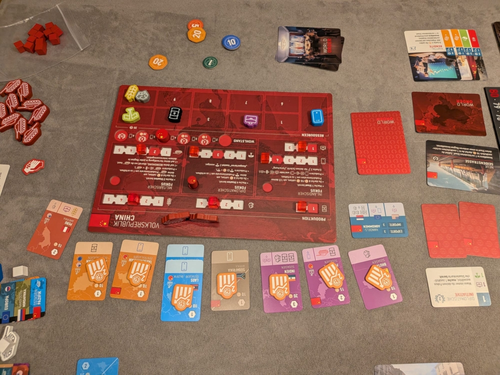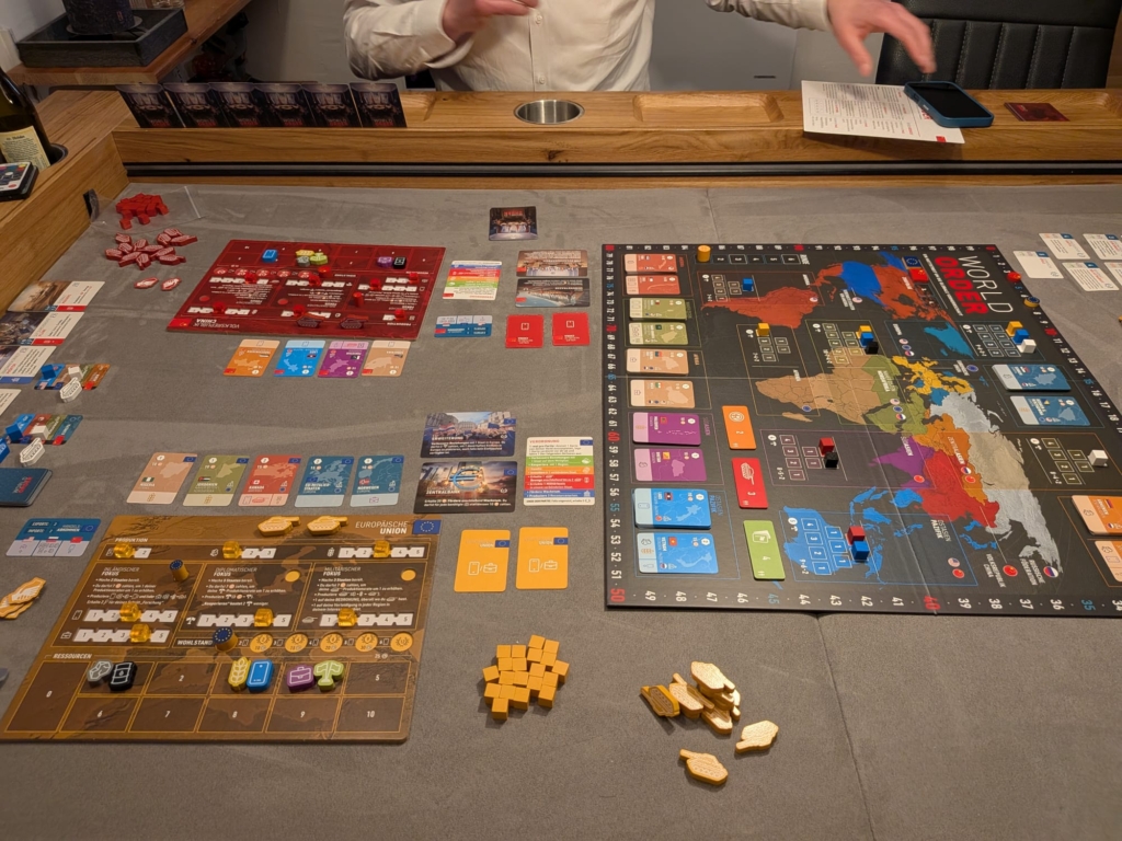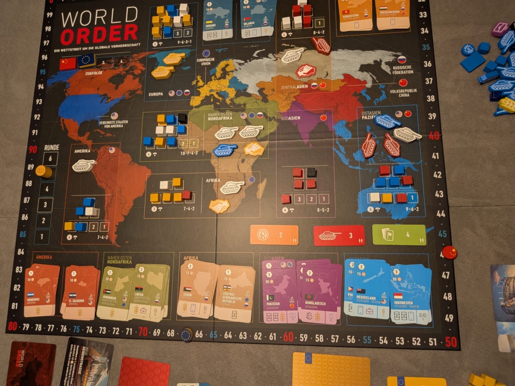 Das Thema mag in der momentanen politischen Weltsituation etwas makaber wirken. Ich müsste noch mal schauen, aber ich bin der Meinung, dass ich ein Interview oder eine Stellungnahme von den Autoren gelesen haben, dass sie ebenso geschockt sind, wie wir, was gerade auf der Weltpolitischen Drehscheibe passiert. World Order spielt im Grundspiel im Jahr 2010, vor Corona, vor Ukraine, vor Trump Teil 2, um nur einige der Dinge zu nennen. Daher rollen wir nicht in Risiko-Manier mit der Geheimkarte Welteroberung durch die Weltkugel, sondern müssen unserer staatlichen Geschicke mit Drohgebärden, Handel und diplomatischen Geschick lenken. Bill hat schon geschrieben, dass es Area Control Anteile hat, aber diese sind eher in Racing-Mechanismen versteckt. Es gibt oft darum als erste Person Einfluß zu platzieren, Punktekarten einsammeln oder ähnliches. Man kann der konkurrierenden Regierung zwar auch einen Panzer in den Garten stellen und diese so ärgern, aber in unserer Erstpartie war dafür kaum Zeit. Apropos Erstpartie: Ohne Regelerklärung haben wir die Weltgeschicke 2,5 Stunden gewidmet, wobei die Zeit wie im Fluge verging.