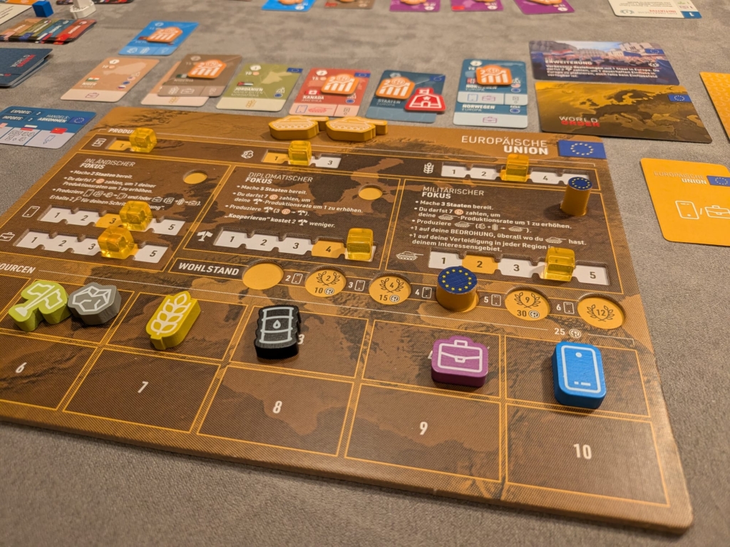 Während sich Horst als meine konkurierende Großmacht die Volksrepublik China ausgewählt hat, gibt die Spielanleitung vor, dass man zu zweit gegen China oder Russland die USA oder die Europäische Union als Gegenpart auswählen soll. Das ist aber die einzige Einschränkung solcher Art. Wer nun von dem Vorgänger Hegemony anderes gewohnt ist: ab einer Partie zu dritt werden hier bereits keine Vorgaben mehr gemacht. Ich wählte Europa, deren Farbe gelb ist – das allein ist bereits ein Grund dafür in meinen Augen!